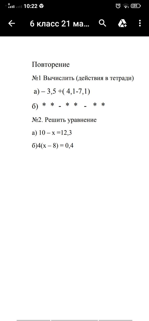 6 класс 21 ма... Повторение №1 Вычислить (действия в тетради) а) -3,5+(4,1-7,1) б) * * * - * * * - * * * - * * №2. Решить уравнение а) 10 - x = 12,3 б) 4(x - 8) = 0,4