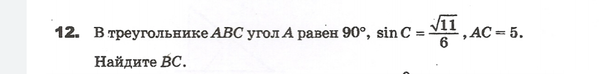 в треугольнике ABC угол A равен 90°, sinC=sqrt(11)/6, AC = 5. найдите BC.