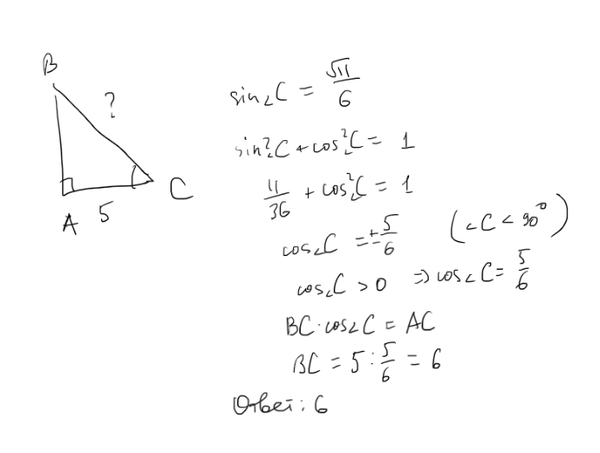 Δ АВС- прямоугольный. cos ∠ C=AC/BC ⇒ BC=AC/cos ∠ C sin^2 ∠ C+cos^2 ∠ C=1 cos^2 ∠ C=1-(11/36)=25/36 cos ∠ C= ± (5/6) ∠ С- острый ⇒ cos ∠ C= (5/6) BC=5/(5/6)=[b]6[/b]