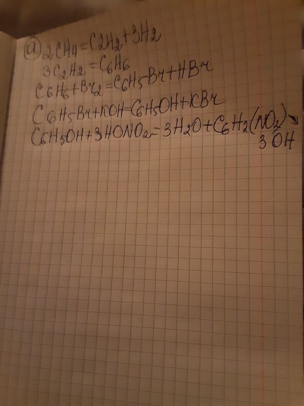 3. Осуществите цепочки превращений: а) Метан → ацетилен → бромбензол → фенол → 2,4,6 тринитрофенол б) Этан → хлорэтан → этанол → этаналь (- > уксусная кислота) → этанол
