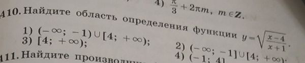 410. Найдите область определения функции y = √(x - 4 / x + 1) 1) (-∞; -1) ∪ [4; +∞); 3) [4; +∞); 2) (-∞; -1] ∪ [4; +∞); 4) (-1; 4] 411. Найдите производн