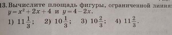 3. Вычислите площадь фигуры, ограниченной линиями y = x² + 2x + 4 и y = 4 - 2x. 1) 11 1/3; 2) 10 1/3; 3) 10 2/3; 4) 11 2/3.