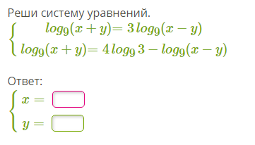 Реши систему уравнений. { log₉(x + y) = 3log₉(x - y) log₉(x + y) = 4log₉3 - log₉(x - y) } Ответ: { x = y = }