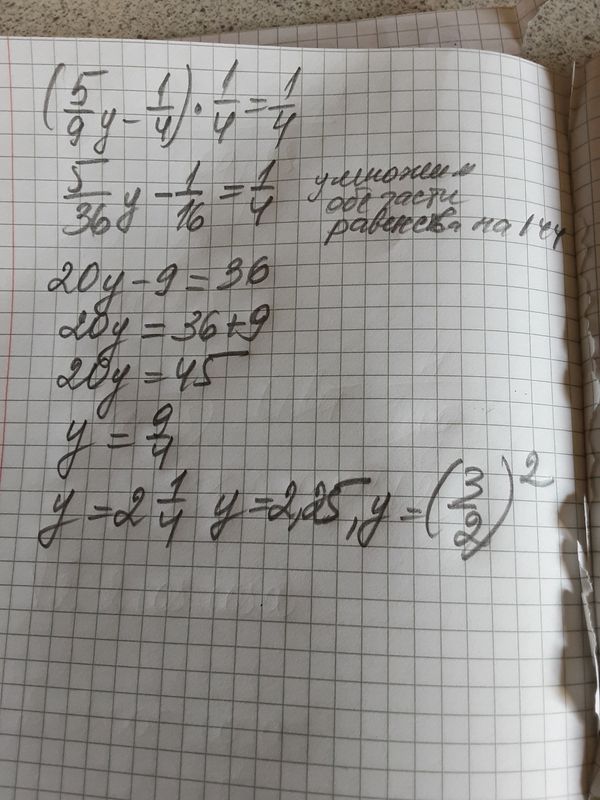 Реши уравнение: (5/9y−1/4)⋅1/4=1/4.