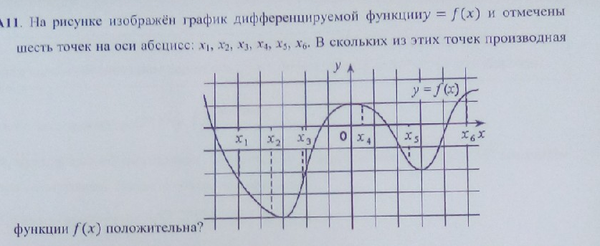 На рисунке изображён график дифференцируемой функции [m] f(x) [/m] и отмечены шесть точек на оси абсцисс: [m] x_1, x_2, x_3, x_4, x_5, x_6 [/m]. В скольких из этих точек производная функции [m] f(x) [/m] положительна?