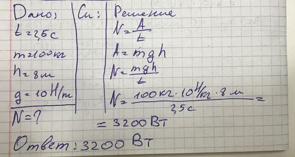 Определить мощность погрузчика, который за 2,5 с поднял груз массой 100 кг на высоту 8 м. g=10 (ответ записать просто числом)