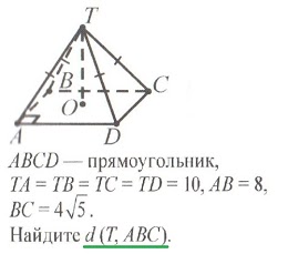 AC^2=AB^2+BC^2=64+80=144 AC=12 AO=AC/2=6 d(T, ABC)=TO=sqrt(TA^2+AO^2)=sqrt(10^2+6^2)=sqrt(136)