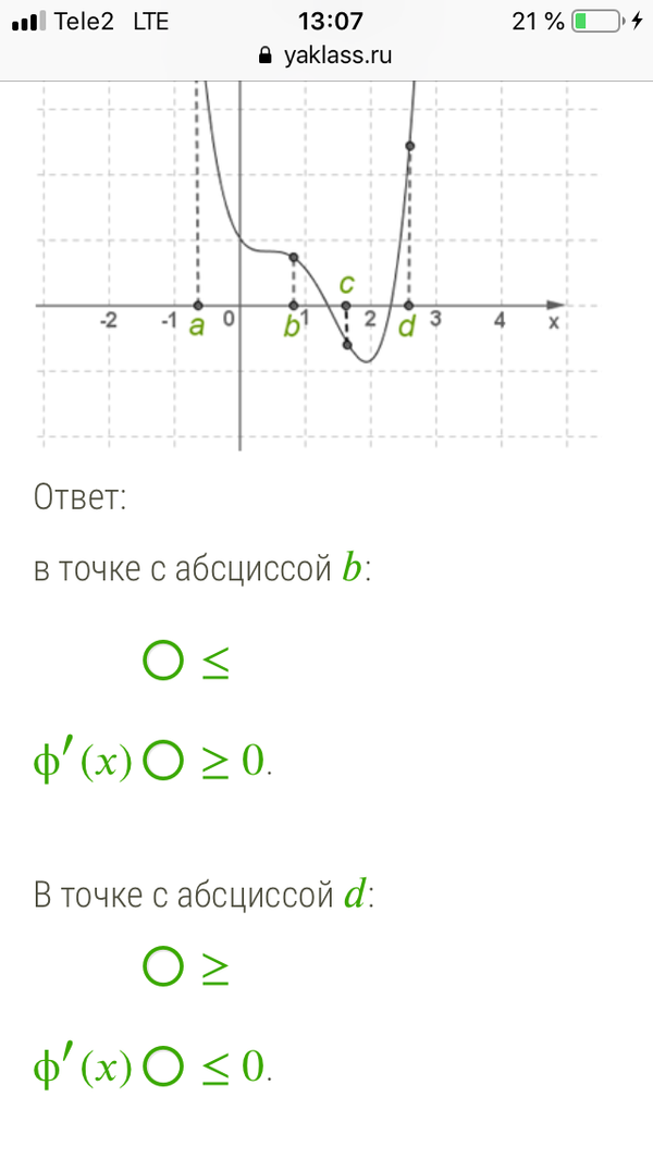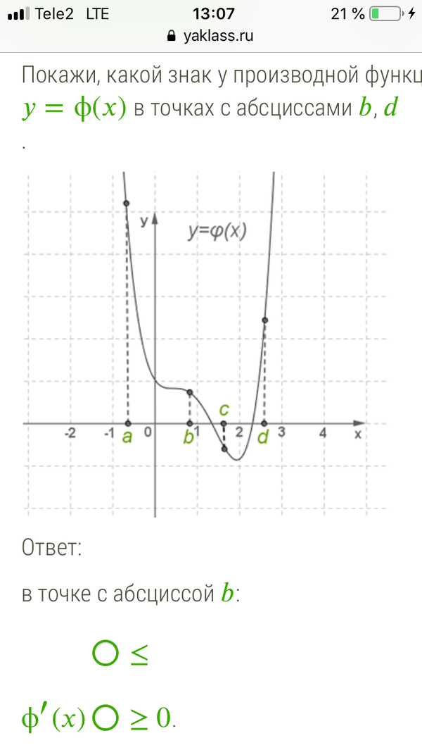 Покажи, какой знак у производной функц ???? = ????(????) в точках с абсциссами ????, ???? Ответ: в точке с абсциссой ????: О ≤ ????′(????) О ≥ 0. В точке с абсиссой ????: О ≥ ????′(????) О ≤ 0.