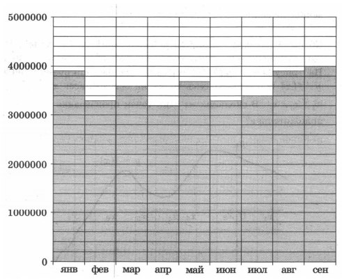 На диаграмме показано число запросов со словом КИНО, сделанных на некотором поисковом сайте во все месяцы с января по сентябрь 2010 года. По горизонтали указываются месяцы, по вертикали — число запросов за данный месяц. Определите по диаграмме наибольшее месячное число запросов со словом КИНО в указанный период.