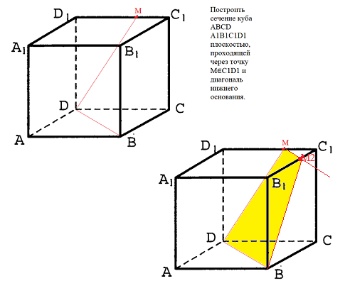 Построить сечение куба ABCD A1B1C1D1 плоскостью, проходящей через точку M∈C1D1 и диагональ нижнего основания.