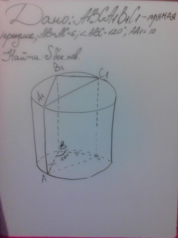 Дано: ABCA1B1C1 - прямая призма, AB=AC=6; угол ABC=120, AA1=10. Найти площадь боковой поверхности.