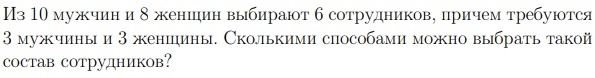 Из 10 мужчин и 8 женщин выбирают 6 сотрудников, причем требуются 3 мужчины и 3 женщины. Сколькими способами можно выбрать такой состав сотрудников?