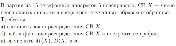 В партии из 15 телефонных аппаратов 5 неисправных. СВ X — число неисправных аппаратов среди трех, случайным образом отобранных.