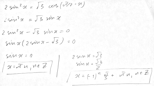 По формулам привидения получим. 2(sin^2)x=sqrt(3)sinx