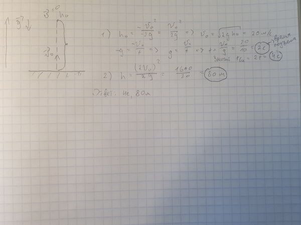 Брошенный вверх камень поднялся на высоту h0 = 20 м. Через какое время t он упадет на землю. На какую высоту поднимется камень, если начальную скорость увеличить вдвое.