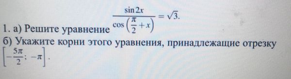 (sin2x)/(cos(pi/2+x))=sqrt(3) на отрезке [-5pi/2;-pi]