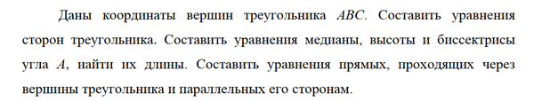 Даны координаты вершин треугольника АВС. Составить уравнения сторон треугольника.Составить уравнения медианы, высоты и биссектрисы угла А,найти их длины. Составить уравнения прямых, проходящих через вершины треугольника и параллельных его сторонам.