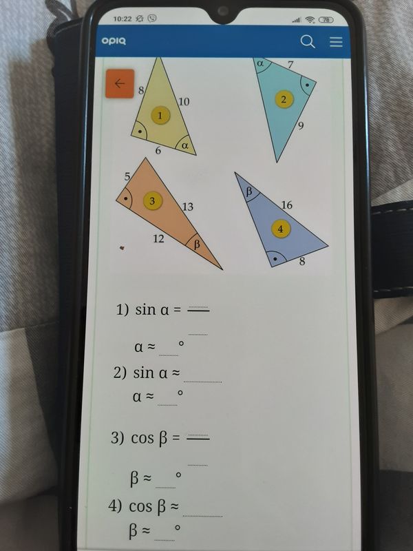 За x буду обозначать угол альфа 1) sin(x) = 0.8, x = arcsin(0.8) ≈ 53 2) sin(x) = 9/sqrt(130) = 0.789, x = arcsin(9/sqrt(130)) ≈ 52 3)cos(x) = 12/13 = 0.92, x = arccos(12/13) ≈ 22 4) cos(x) = 8sqrt(3)/16, x = arccos(8sqrt(3)/16) ≈ 30