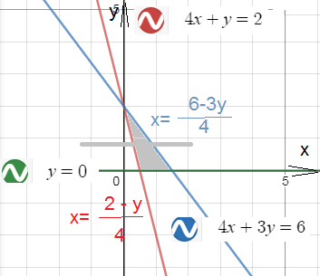 V= ∫ ∫ _(D)(2-x-y)dxdy= ∫ ^(2)_(0)([blue]∫ ^((6-3y)/4)_((2-y)/4)(2-x-y)dx[/blue])dy= =∫ ^(2)_(0) (2x-(x^2/2)-yx)| ^((6-3y)/4)_((2-y)/4)dy= =∫ ^(2)_(0) (2*(6-3y)/4) -(1/2)*(6-3y)/4)^2-y*((6-3y)/4)- 2*((2-y)/4)+((2-y)/4)^2/2+y*(((2-y)/4)) dy=...