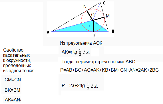 Дан ΔABC, в нём известны ∠A, сторона лежащая против угла A, равна a, и известен радиус вписанной окружности - p. Используя известные величины написать формулу нахождения других сторон треугольника