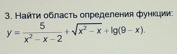 {x^2-x ≥ 0 ⇒ x ≤ 0 или х ≥ 1 {x^2-x-2 ≠ 0 ⇒ D=9; x ≠ -1; x ≠ 2 {9-x >0 ⇒ x < 9 x ∈ (- ∞ ;-1) U(-1;0] U[1;2)U(2;9)