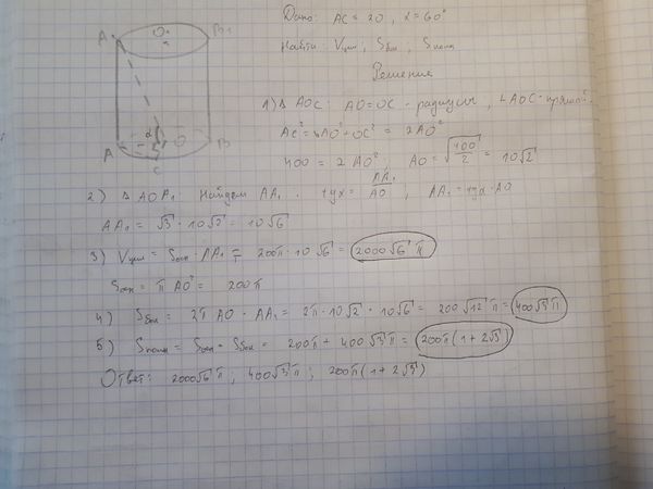 ОО 1 – ось цилиндра. Найти объем и площади боковой и полной поверхностей цилиндра.