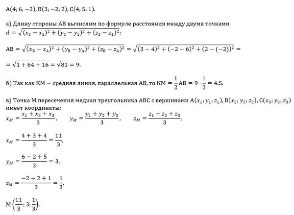 Треугольник ABC задан своими вершинами : А(4;6;-2),B(3;-2;2) C(4;5;1) Найти a) длину стороны АВ б) длину средней линии KM параллельна АВ в) координаты точки пересечения медиан