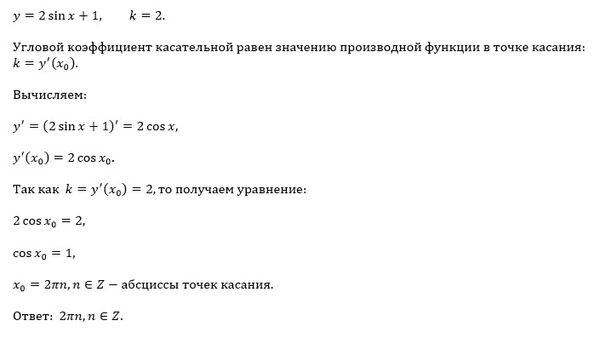 ПОМОГИТЕ С ПОДРОБНЫМ РЕШЕНИЕМ Определите абсциссы точек ,в которых угловой коэффициент касательной к графику функции y= 2sinx+1 равен 2.