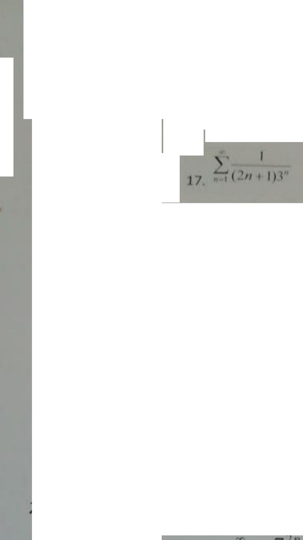 Сходится по признаку Даламбера lim_(n → ∞ ) a_(n+1)/a_(n)=lim_(n → ∞ ) (2n+1)/(3*(2n+3))=1/3 < 1