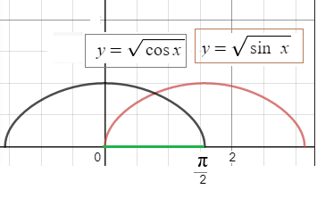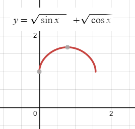 Cм графики y=sqrt(sinx) и y=sqrt(cosx) на рис.1 Тогда сумма y=sqrt(sinx)+sqrt(cosx) определена на [0;π/2] и принимает значения 1 ≤ y ≤ sqrt(sin(π/4))+sqrt(cos(π/4))=2sqrt(sqrt(2)/2) ≈ 1,67 (cм. рис.2) В силу периодичности, ответ (0+2πn; (π/2)+2πn), n ∈ Z
