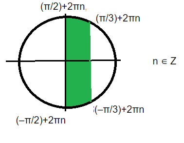(-π/2)+2πn ≤ 2x ≤(-π/3)+2πn или (π/3)+2πn ≤ 2x ≤(π/2)+2πn, n ∈ Z