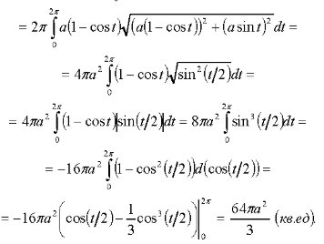 [b](x`_(t))^2+(y`_(t))^2=[/b] a^2([b]1-2cost+cos^2t+sin^2t[/b])=a^2([b]2-2cost[/b])=a^2*2*(2sin^2t/2)=4a^2sin^2(t/2)