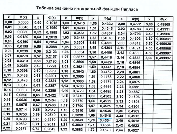 Ф(x_(2))=Ф(1,7)=0,4554 ( cм таблицу )