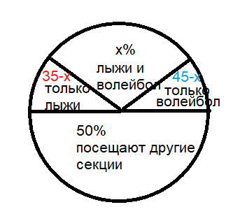 50%- выбирали другие секции ⇒ 50% - посещают лыжи и волейбол.
