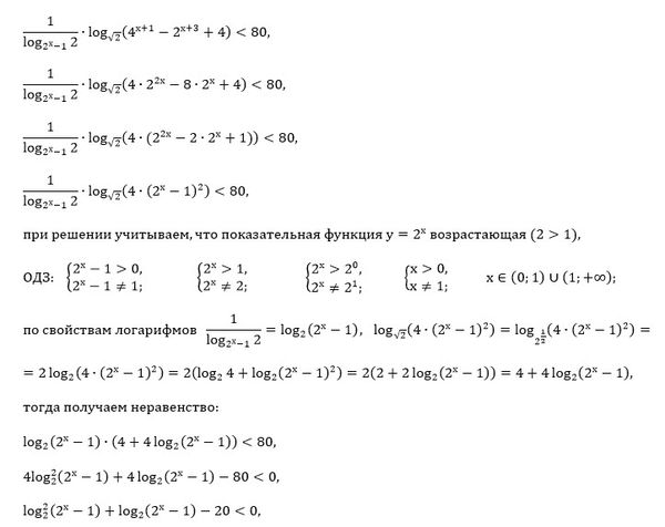 Решить неравенство (1 / log(2^x-1)2) * log(√2)(4^(x+1) - 2^(x+3) + 4) < 80