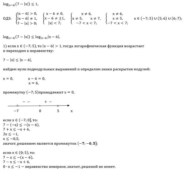 Решите неравенство log(|x-6|)(7 - |x|) ≤ 1.