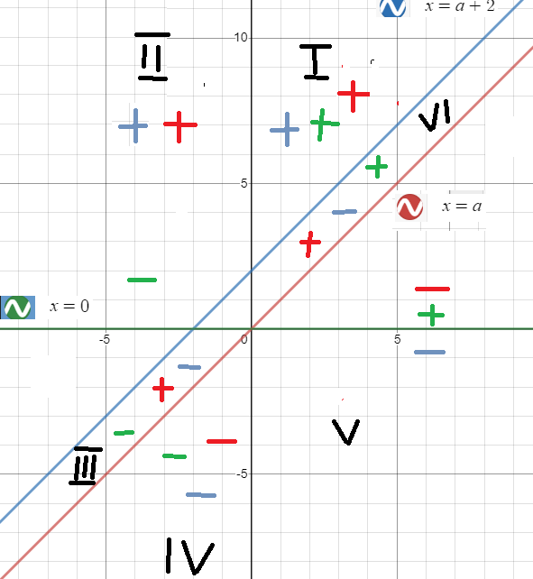 Прямые x=a+2 и x=a разбивают координатную плоскость хОа: