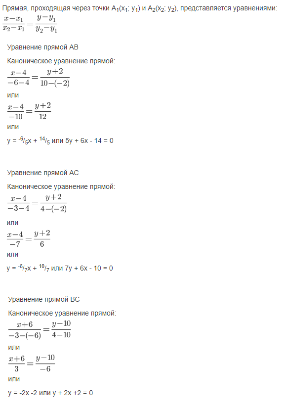 А(4;-2), В(-6;10), С(-3;4). Составьте уравнения его сторон.