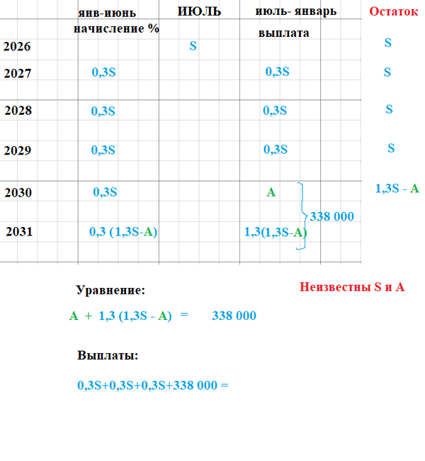 Cумма выплат: 0,3S+0,3S+0,3S+338 000= 0,9·230 000+338 000=