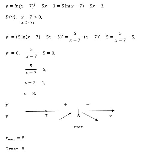Найти точку максимума y=ln(x-7)^5-5x-3...