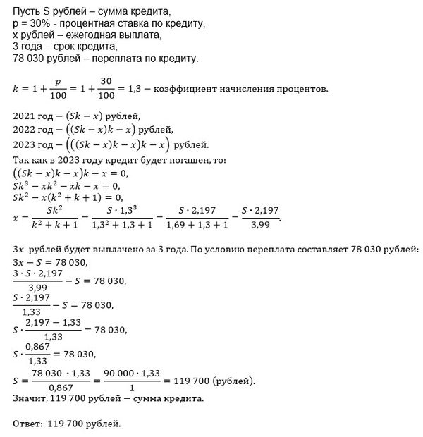 Определите сумму кредита, если известно, что кредит был выплачен тремя равными платежами (за 3 года) и общая сумма выплат на 78 030 рублей больше суммы, взятой в кредит.