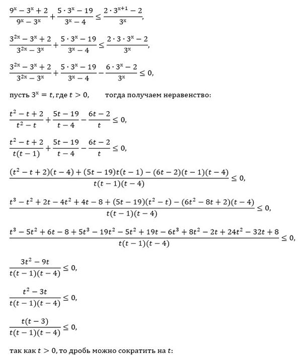 [block](9^x-3^x+2)/(9^x-3^x)+(5*3^x-19)/(3^x-4) ⩽ (2*3^(x+1)-2)/(3^x)[/block]