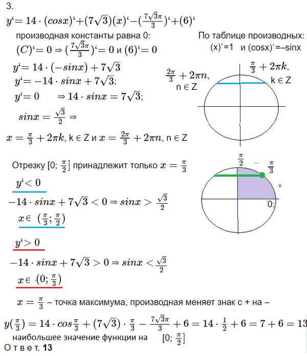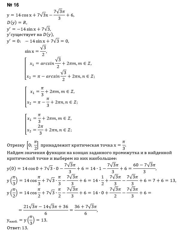 Найдите наибольшее значение функции [m] y = 14 \cos x + 7 \sqrt{3} \cdot x - \frac{7 \sqrt{3} \cdot x}{3} + 6 [/m] на отрезке [m] \left[ 0, \frac{\pi}{2} \right] [/m].