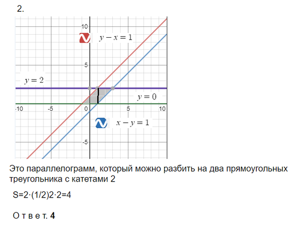 Вычислить площадь четырёхугольника, стороны которого лежат на прямых [m] y - x = 1, x - y = 1, y = 0 [/m] и [m] y = 2 [/m].