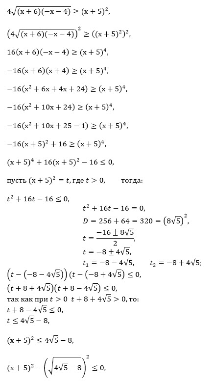 [m]\frac{4}{\sqrt{(x+6)(-x-4)}}\geq \frac{(-x-5)^2}{(x+6)(-x-4)}[/m]