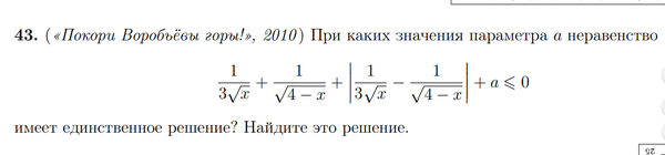 [m]\left\{\begin{matrix} \frac{1}{3\sqrt{x}}-\frac{1}{\sqrt{4-x}}\geq 0\\\frac{1}{3\sqrt{x}}+\frac{1}{\sqrt{4-x}} +\frac{1}{3\sqrt{x}}-\frac{1}{\sqrt{4-x}}+a\leq 0 \end{matrix}\right.[/m]