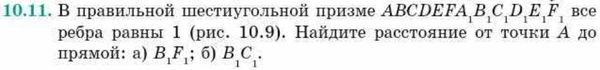 В правильной шестиугольной призме ABCDEFA1B1C1D1E( все ребра равны 1 (рис. 10.9). Найдите расстояние от точки А до прямой: а) б) ВС