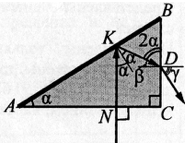 Поскольку луч падает на грань АС перпендикулярно, он на ней не преломляется, а, падая на грань АВ, согласно закону отражения света отражается под тем же углом α. Следовательно, так как KN || ВС, то β = 90 - 2α.
