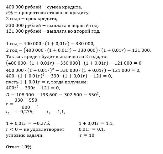Найдите r, если известно, что кредит будет полностью погашен за два года, причём в первый год будет выплачено 330 000 рублей, а во второй год— 121 000 рублей.
