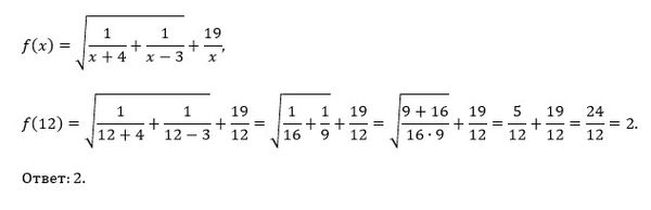f(x) = sqrt(1/(x+4)+1/(x-3))+19/x. Найти f(12)
